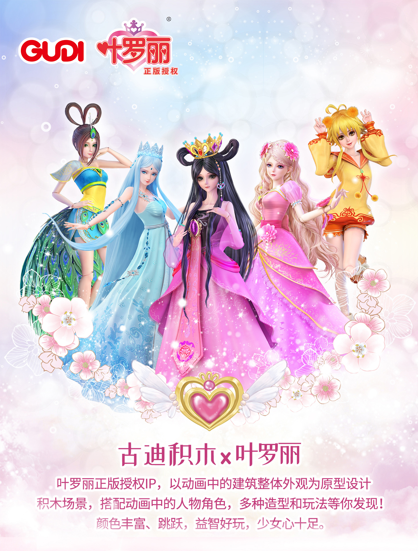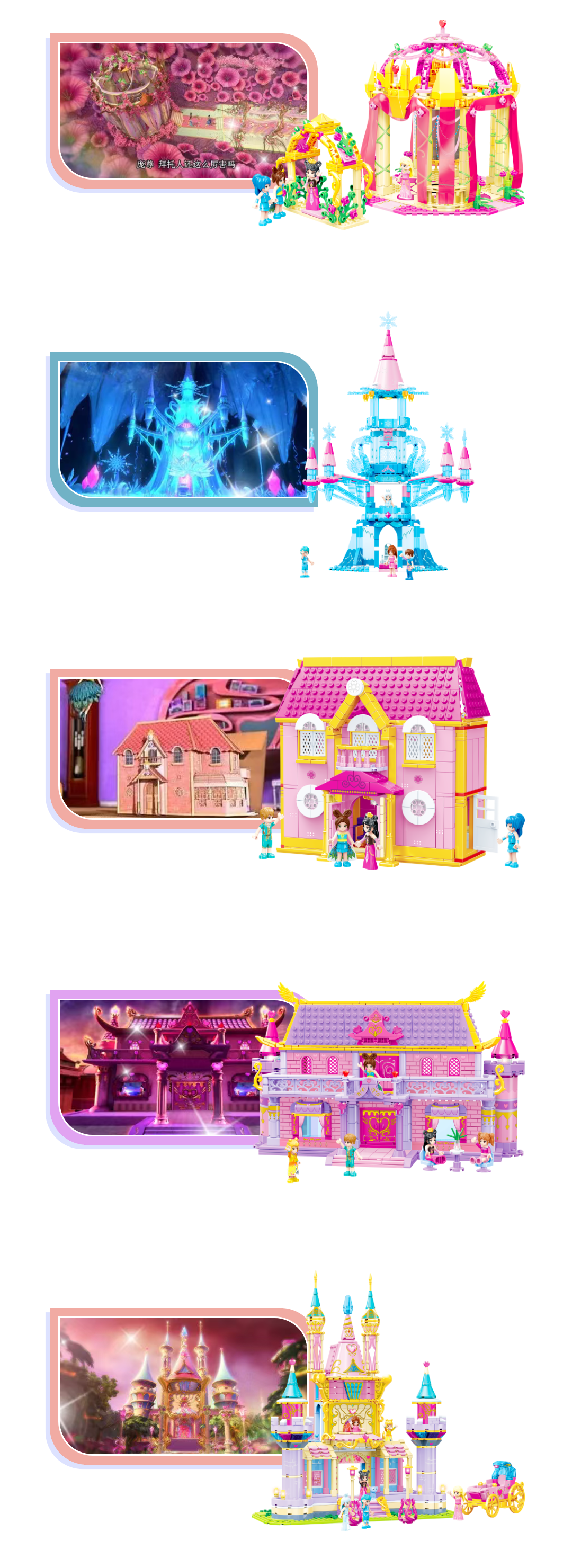 古迪積木x葉羅麗聯(lián)名積木系列,總共五款:靈公主花圣殿、冰公主冰宮殿、孔雀的房子、葉羅麗娃娃店、羅麗的城堡,都是以葉羅麗動畫中的建筑整體外觀為原型設(shè)計積木場景。