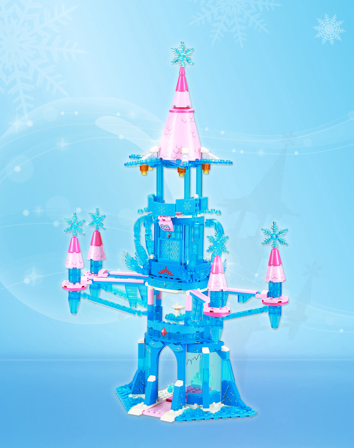 葉羅麗動畫中的宮殿、城堡特色鮮明,夢幻迷人,將動畫中的場景復(fù)刻現(xiàn)實(shí),需經(jīng)過精巧設(shè)計,如冰公主的冰宮殿,以藍(lán)色為主色調(diào)和華麗晶瑩剔透的冰晶呈現(xiàn),而古迪積木根據(jù)仙境元素,運(yùn)用積木展現(xiàn)冰晶透明質(zhì)感。